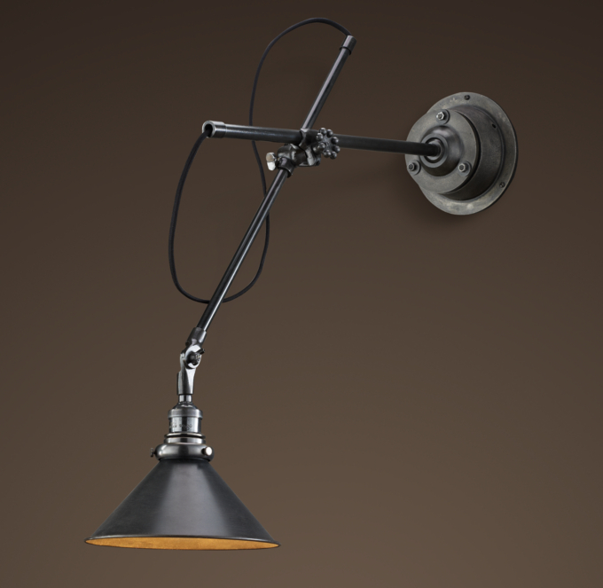 Next up in this room: I have to finish the 3 Roman Shades in the Dwell Vintage Blossom fabric and bind the quilt I made for the bed; MJP has to replace what we unaffectionately refer to as the ugliest sconces we have ever seen (shown in the before pic, very high up on the wall), with these new ones, also from Restoration Hardware.